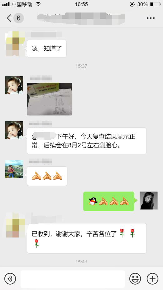“今天的复查结果显示正常,后续会在8月2号左右测胎心”检查结果出来后,我们后勤的同事,马上把这个好消息分享给了H女士。